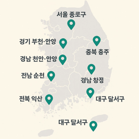 - 1단계 (2022.7~2024.12): 서울 종로구, 경기 부천시, 충남 천안시, 전남 순천시, 경북 포항시, 경남 창원시