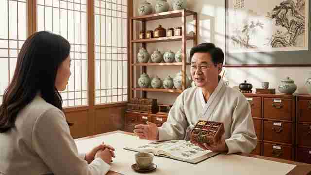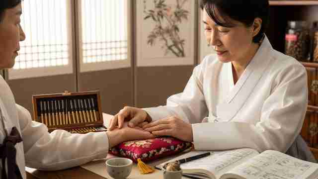 환자가 의자에 앉아 한의사와 상담하는 장면공진단과 경옥고가 함께 놓인 테이블 구성