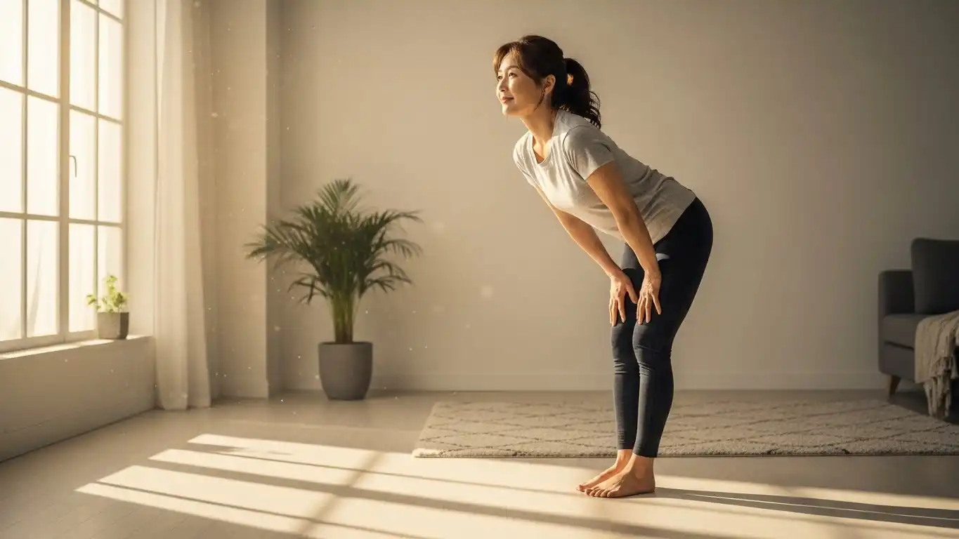 허벅지 뒤 근육(햄스트링)이 뻣뻣하면 허리가 더 당겨집니다. 의자에 앉아 한쪽 다리를 쭉 뻗고 상체를 앞으로 천천히 숙여보세요. 이 동작은 신경 긴장을 완화시켜 협착증 통증을 줄여줍니다.