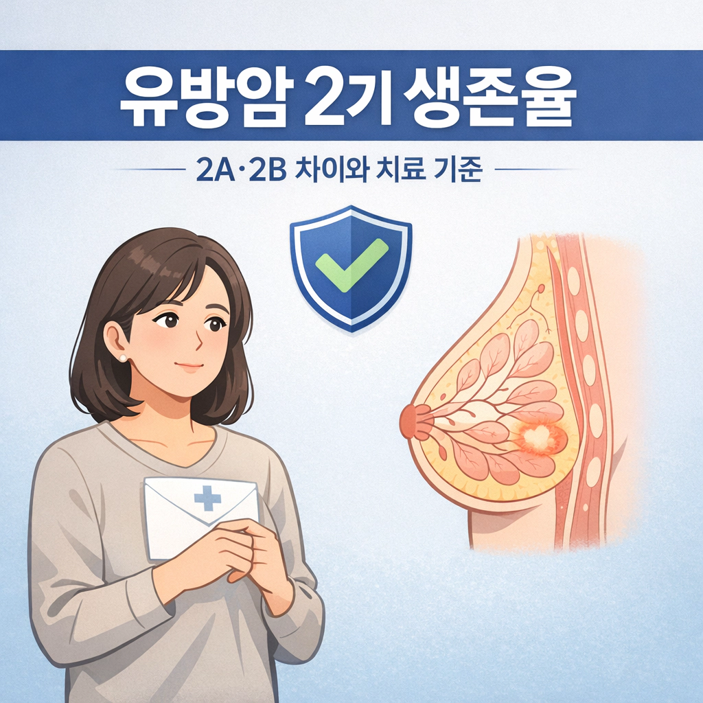 유방암 2기 진단을 받으면 제일 먼저 떠오르는 질문은 하나입니다. “생존율이 얼마나 되나요?” 이 글은 숫자만 나열하지 않고, 40~50대가 실제로 궁금해하는 기준(2A·2B 차이, 치료 흐름, 재발 관리)을 한눈에 요약 → 근거·기준 상세로 정리했습니다.