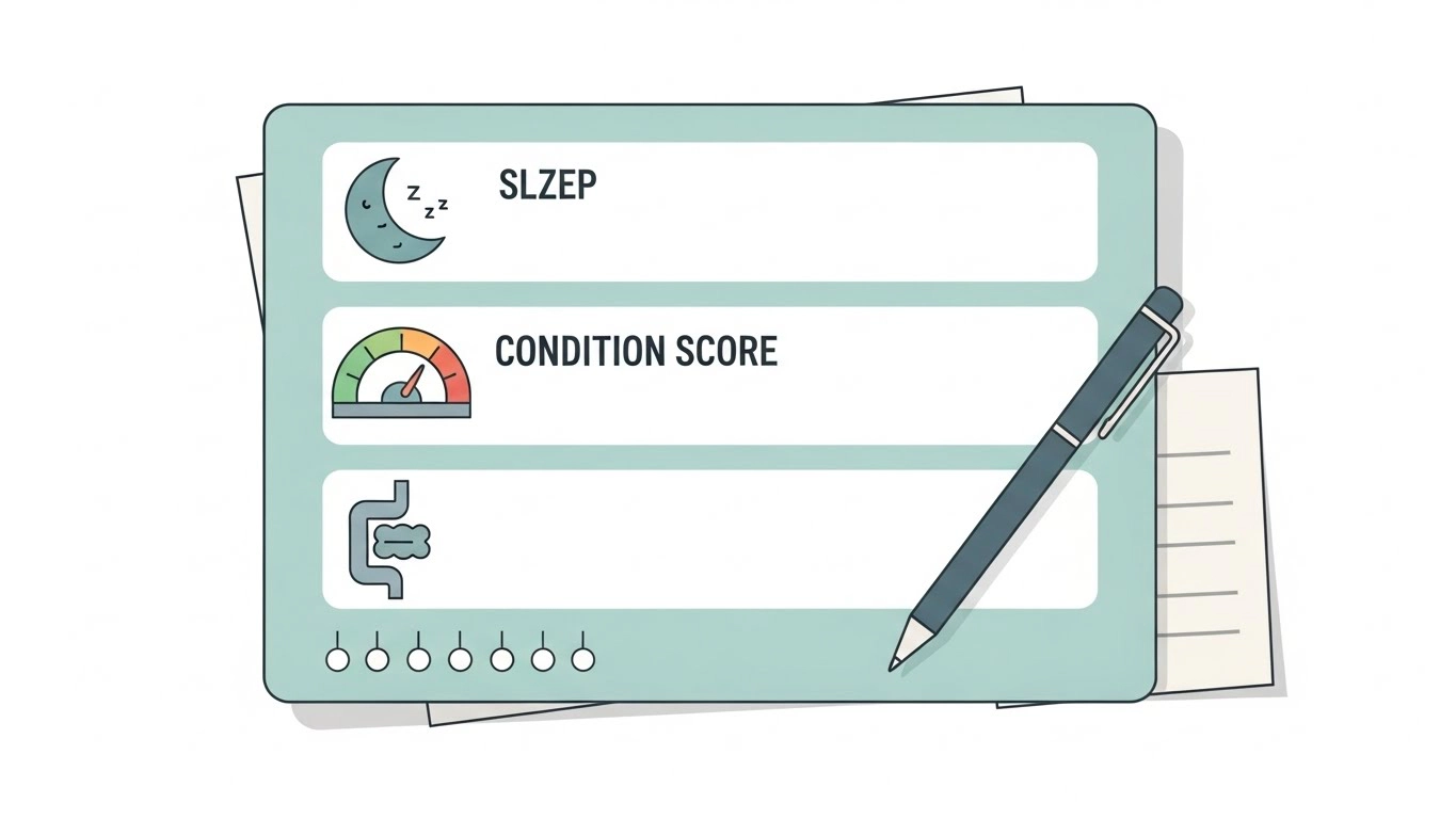 • 기록은 3개만 하세요: 수면(중간 각성), 컨디션(0~10), 장(배변/더부룩).