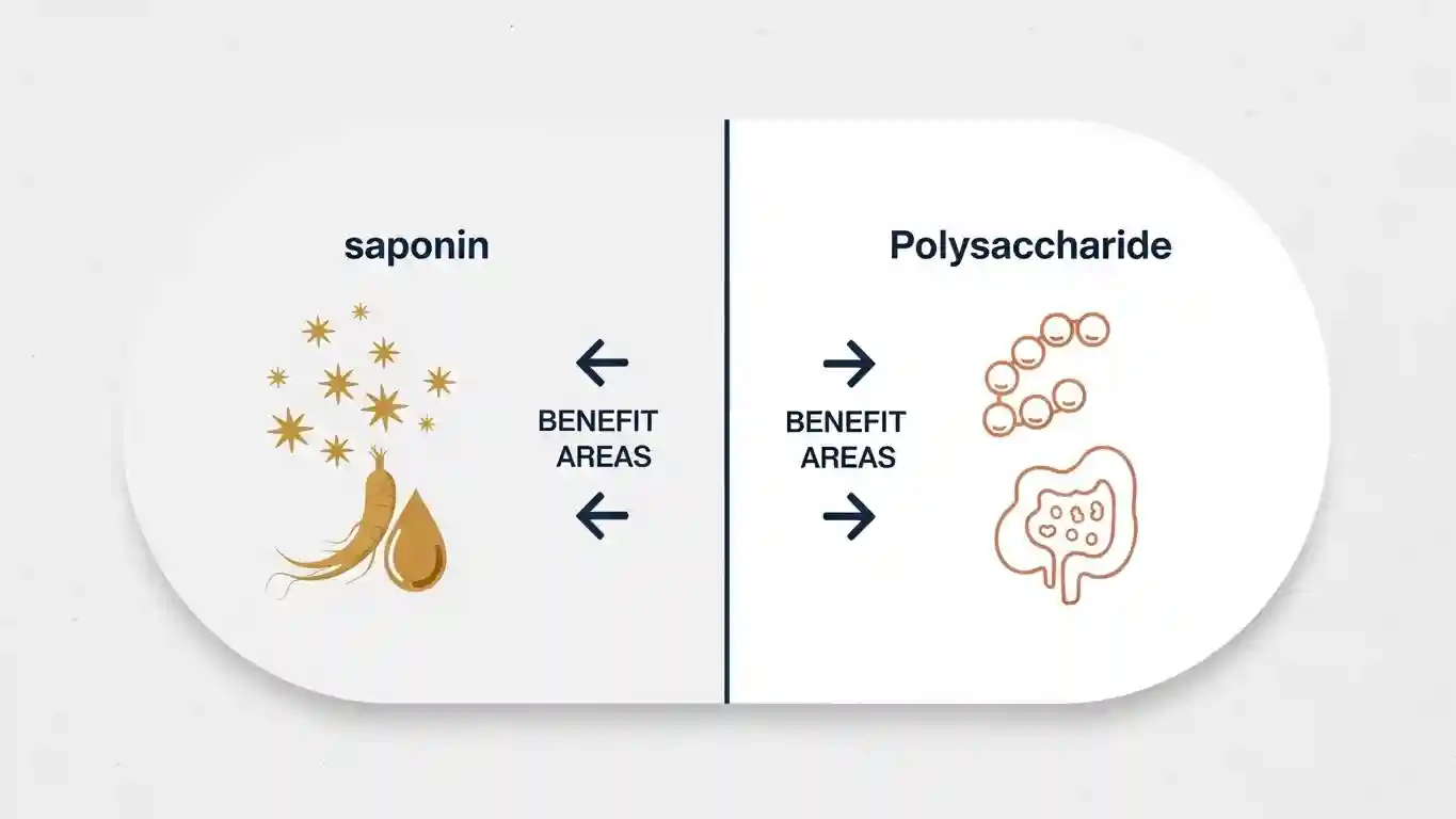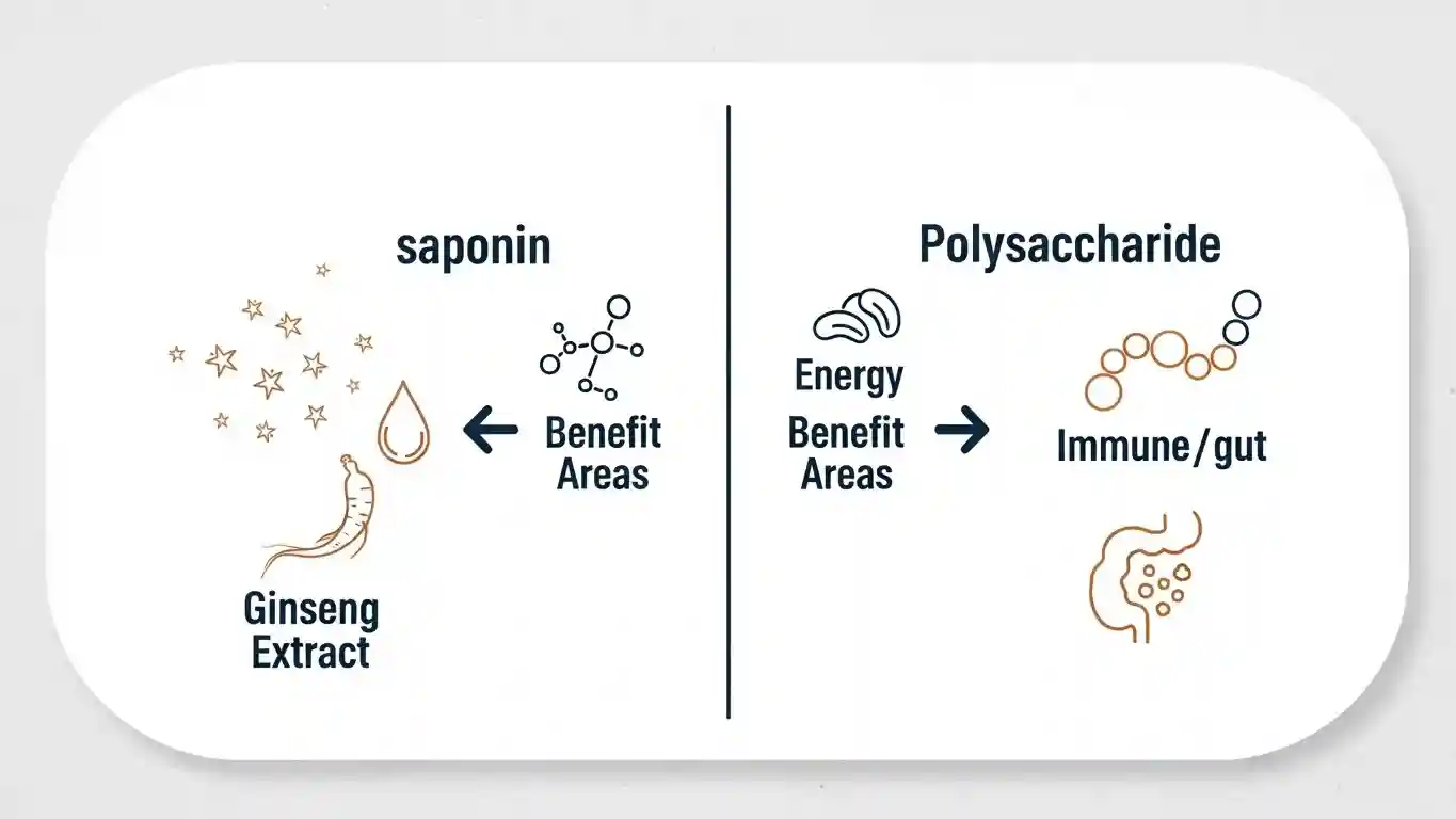 • 인삼 성분은 크게 사포닌(진세노사이드)과 다당류(다당체)로 나뉘어 설명되는 경우가 많습니다.