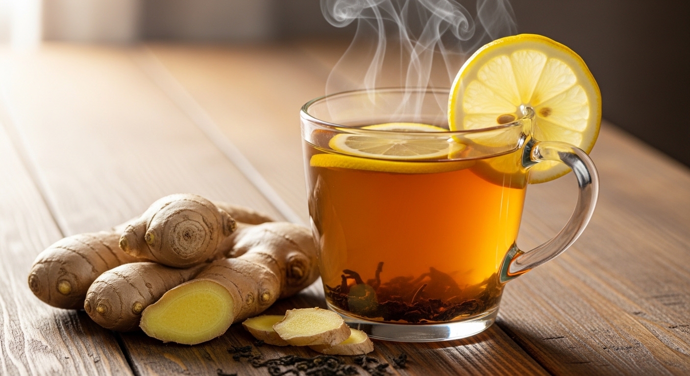 생강 2~3조각을 물 500ml에 10분 끓인 뒤 레몬즙 약간을 넣어 드세요. 하루 1~2잔, 식후에 마시면 소화에도 도움이 됩니다.