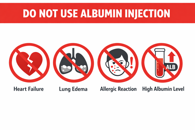 알부민 주사 절대 금기: 알부민 또는 혈액 제제 과민증 / 심부전·폐부종이 있는 경우 / 고알부민혈증 / 탈수 없는 빈혈
