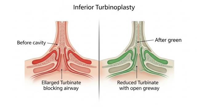 하비갑개 수술(inferior turbinoplasty): 코 안에 있는 하비갑개(점막 조직)가 과도하게 비대해진 경우 레이저·코블레이터·전기소작 등으로 부피를 줄입니다. 국소마취 외래 수술로 20~30분 이내에 가능하며, 회복 기간은 1~2주입니다.