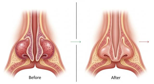 비용종 제거술: 코 안에 물혹(비용종)이 생긴 경우 내시경으로 제거합니다. 수술 후 재발 방지를 위해 비강 스테로이드 스프레이를 장기간 사용해야 합니다.