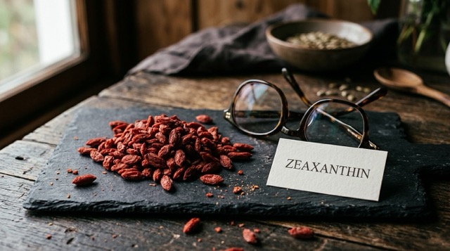 구기자의 가장 잘 알려진 효능은 바로 눈 건강입니다. 구기자 100g에는 제아잔틴(zeaxanthin)이 약 162mg 함유되어 있는데, 이는 단일 식품 중 최고 수준에 속합니다. 제아잔틴은 망막 중심부인 황반(macula)에 집중되어 자외선과 청색광 산화 손상으로부터 시세포를 보호합니다. 스마트폰·모니터 장시간 사용으로 눈의 피로감이 심한 현대인에게 특히 중요한 성분입니다.