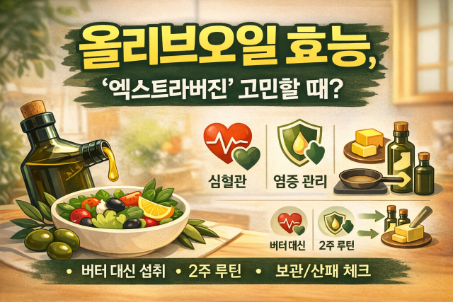 이 글은 올리브오일을 만능처럼 말하기보다, 현실적으로 기대할 수 있는 효능과 실패(산패·속불편·칼로리 과다)를 줄이는 선택/루틴을 소비자 기준으로 정리한 가이드입니다. 특히 버터·마가린을 대체하고 싶은 사람, 식단 루틴을 단순화하고 싶은 사람에게 맞춰 설명합니다.