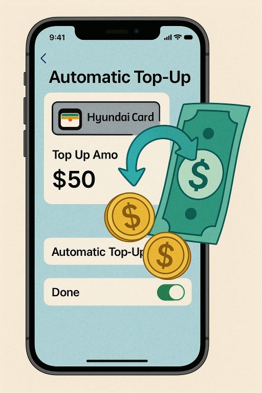 - 등록 후에는 티머니 충전도 가능해지며, 이는 애플 지갑 내 현대카드를 통해 직접 가능하거나, 티머니 iOS 앱을 통해 다른 결제수단으로도 충전할 수 있습니다.