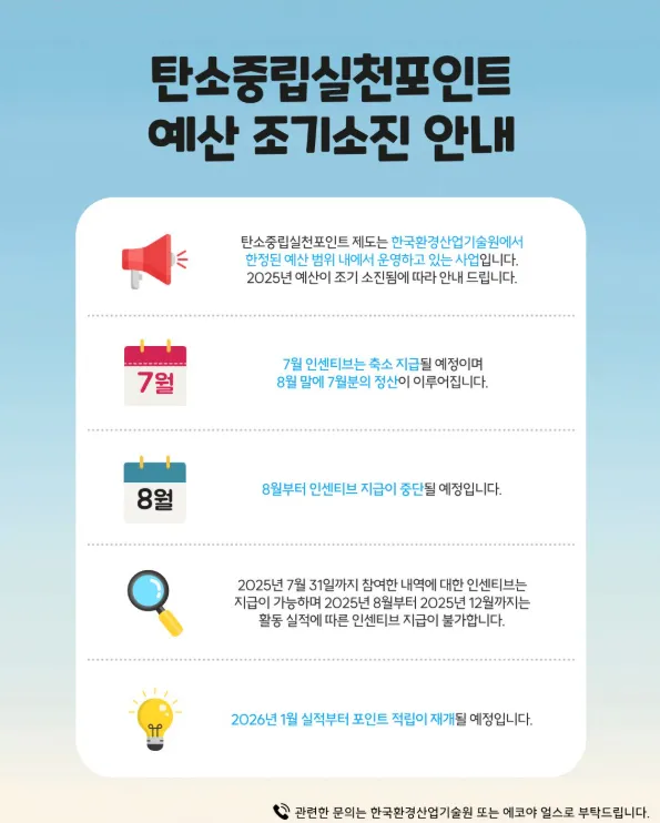 2025년도 예산 160억 원이 벌써 7월에 모두 소진되면서, 환경부 산하 한국환경산업기술원은 8월 1일부터 포인트 지급을 중단한다고 발표했습니다. 이는 제도가 활성화되며 참여 인원이 202만 명을 초과했지만, 예산은 전년 수준으로 동결된 것이 주요 원인으로 분석됩니다.
